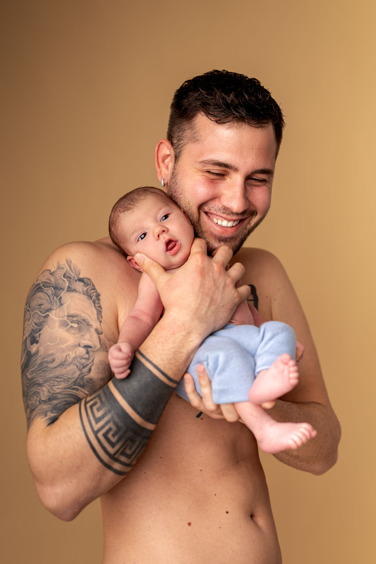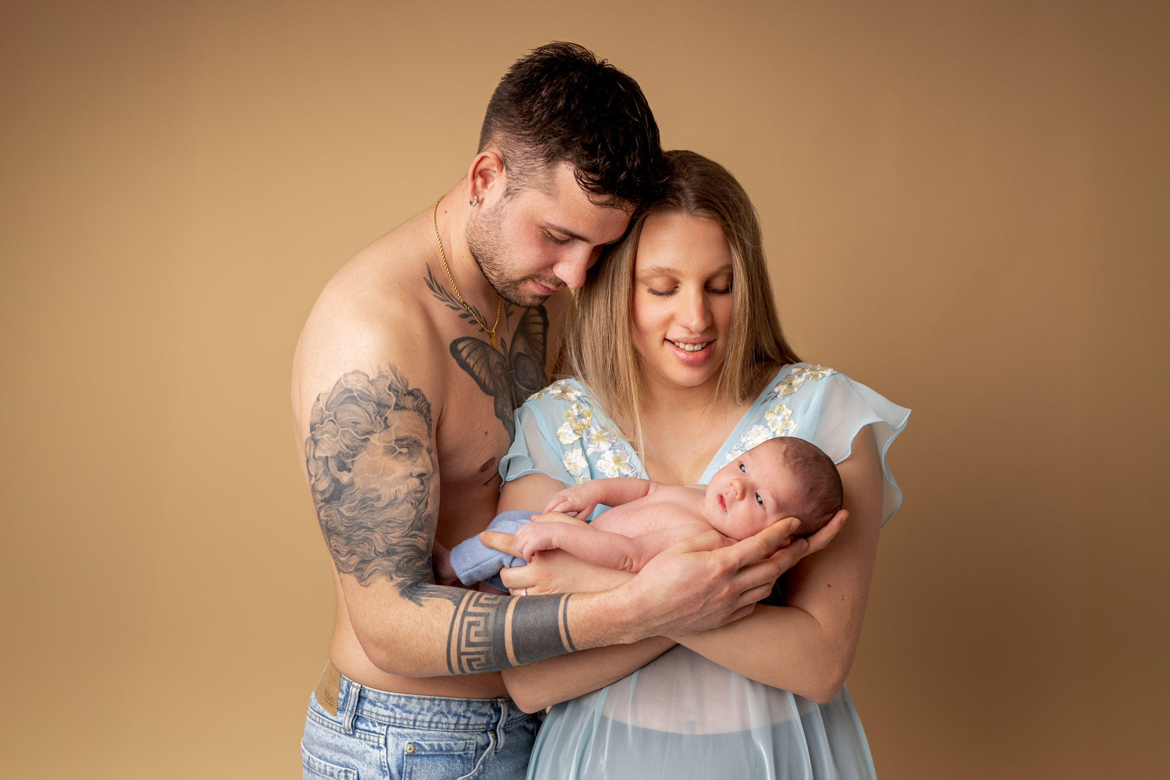 Mamma e papà potranno vestirsi con abiti dai toni chiari o pastello, evitando colori accesi, grandi loghi o pattern particolarmente evidenti. Anche per i fratelli e sorelle vale lo stesso principio. Anche i jeans sono ben accetti. È fondamentale vestirsi a strati o portarsi un cambio, infatti la temperatura dello studio sarà intorno ai 26° per garantire al neonato di stare nudo senza raffreddarsi.